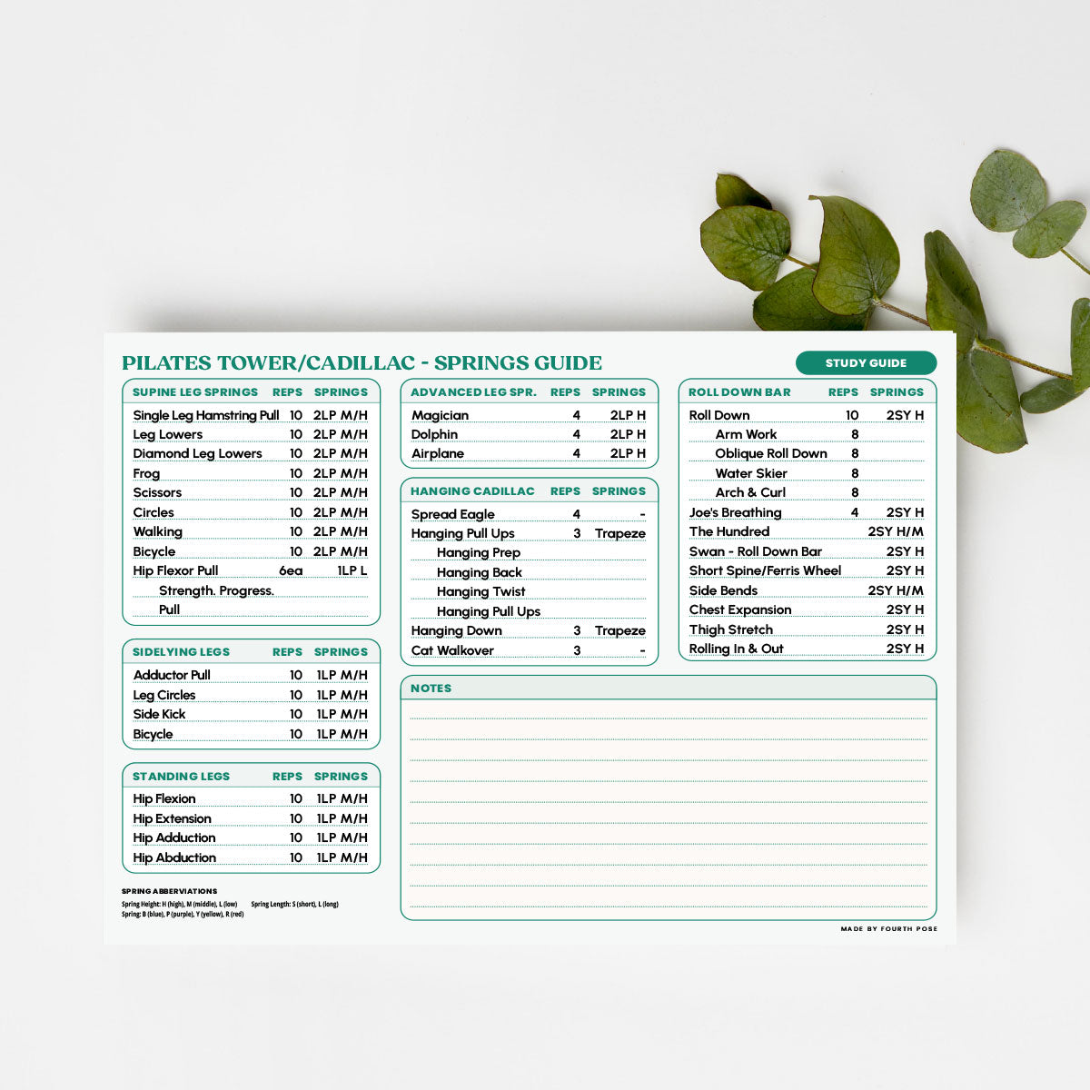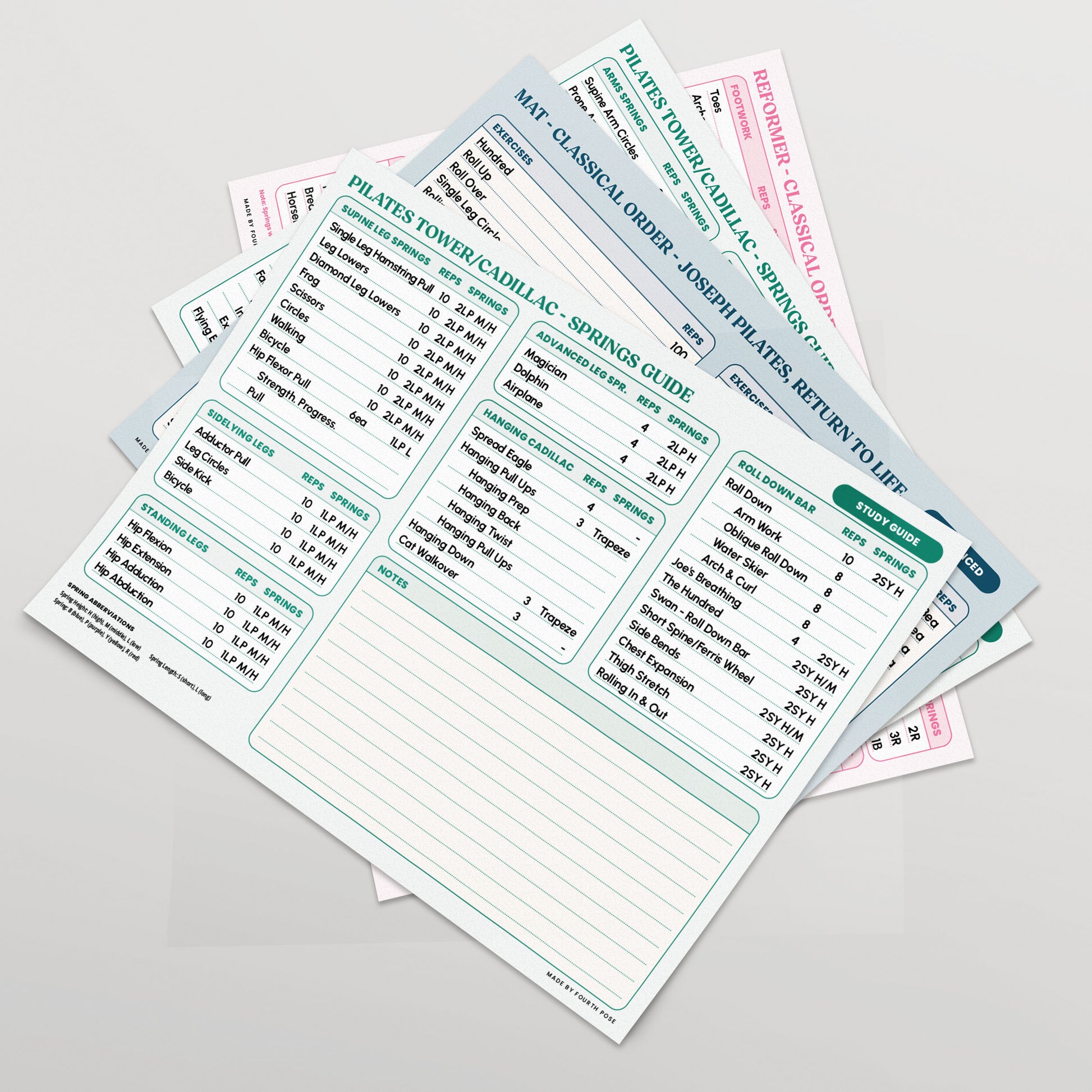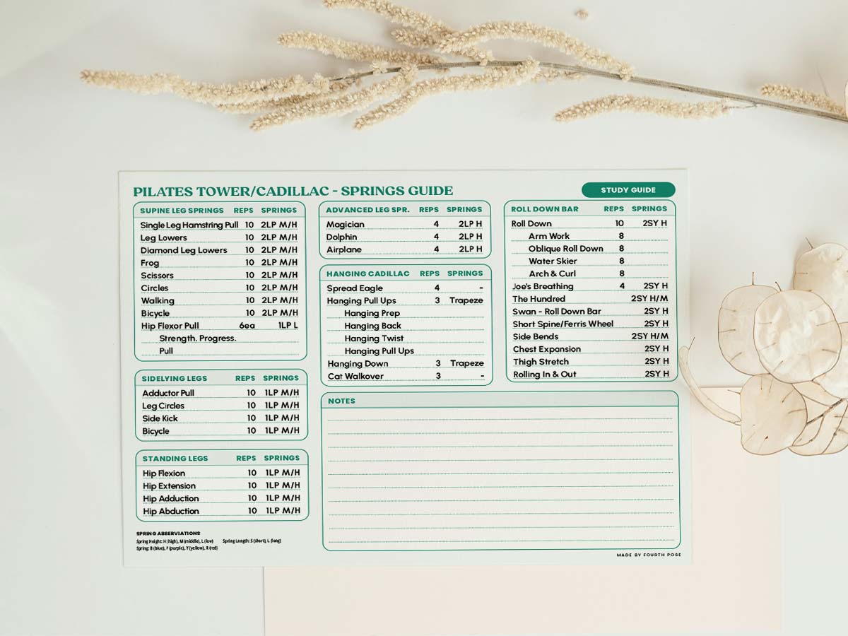 Enhance your Pilates practice with our Cadillac/Tower Study Guide, now available as a printed, physical reference designed for studio use. This clear and accessible 2-page guide outlines the essential spring setups, attachment heights, and key equipment notes for the most commonly used exercises on the Cadillac and Tower apparatus. Rooted in the authentic Pilates method, it’s an ideal quick-reference tool to support both instructors and dedicated practitioners during sessions.